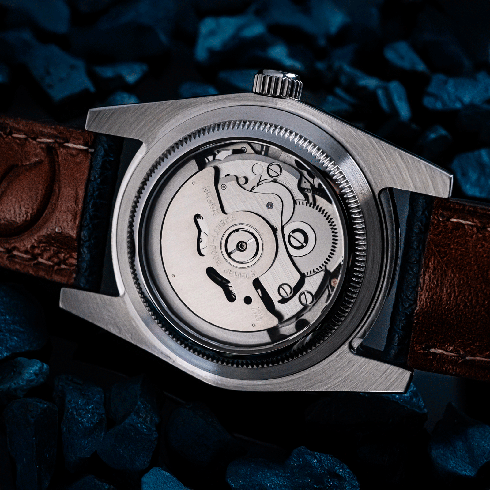 Inside beats the NH35A — a dependable Japanese automatic movement known for its precision and smooth self-winding mechanism.